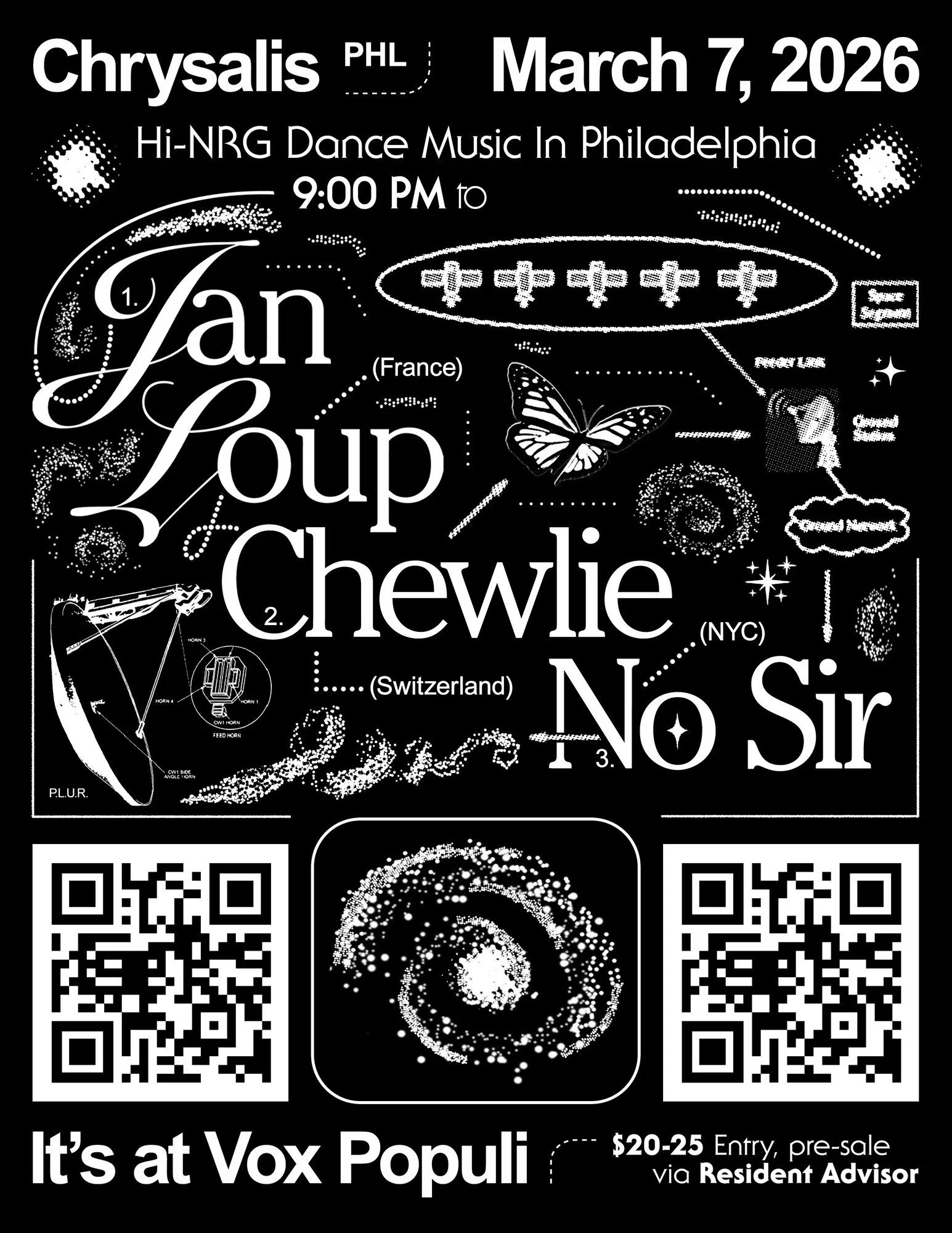 Our chrysalises shake wildly as a primordial sub-bass sound rattles up from deep beneath the earth’s crust… We’ve invited France’s Jan Loup, Switzerland’s Chewlie, and New York’s No Sir to Philly’s home of Flinta-forward dancefloor metamorphosis. These world-class sonic soothsayers promise to crack us open on the dance floor with gargantuan bass energy, hi-fi psychedelia, and percussive frenzy. Join us Saturday March 7 at Vox Populi for a mind-and-body-melting experience.