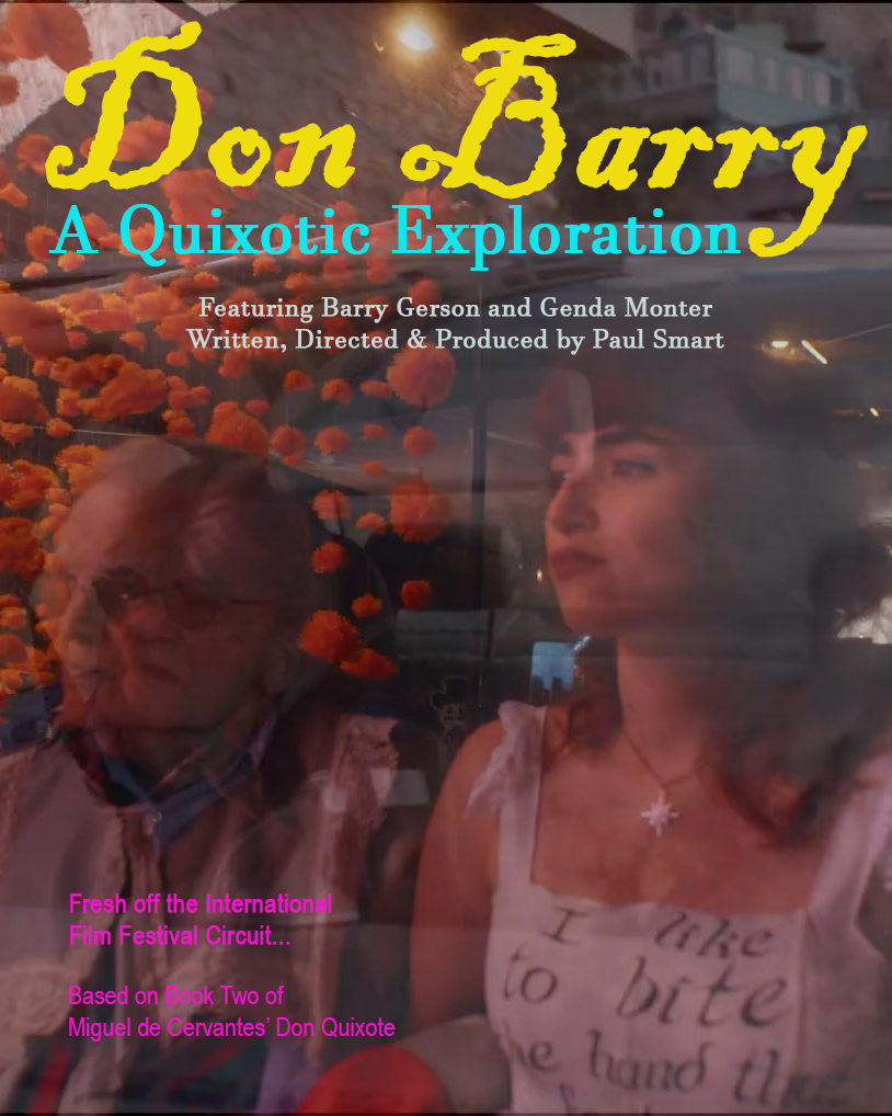 Don Barry: A Quixotic Exploration re-enlivens the meta- narrative of Cervantes’ Don Quixote by placing a real-life experimental filmmaker, Barry Gerson, into the Don’s role and filming his life work’s exploration of madness in a mad world among the crowds of Mexico’s magical city of Guanajuato. There, the life and work of Gerson, in his 80s, is layered atop the first great novel to draw out explorations of intuitive processes, cathartic landscapes, and the specters of death and creative succession. A young assistant (Sanchia, stand-in for Cervantes' Sancho Panza) helps revive Don Barry’s creative drive and push him to expand his cinematic explorations of light into new realms beyond narrative. The film is about the struggles that all artists face in today’s changing world, and the intersections between art and life.