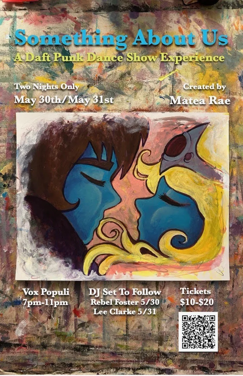 Something about Us: A Daft Punk Dance Show Experience” is going to immerse you into the world of Daft Punk in a way you’ve never experienced before and probably will never experience again. The show is centered around Daft Punk’s 2001 timeless second album, Discovery. This show is a passion project dreamed up by Matea Rae but made a reality with the help and collaboration of a handful of other wonderful dancers and artists. It highlights the importance of art and dance as a conduit for emotional and physical love and connection, pushing back against the commercialization of art and exploitation of artists. Please come connect with us for one of these two magical nights and experience something unlike any other dance show you’ve seen.