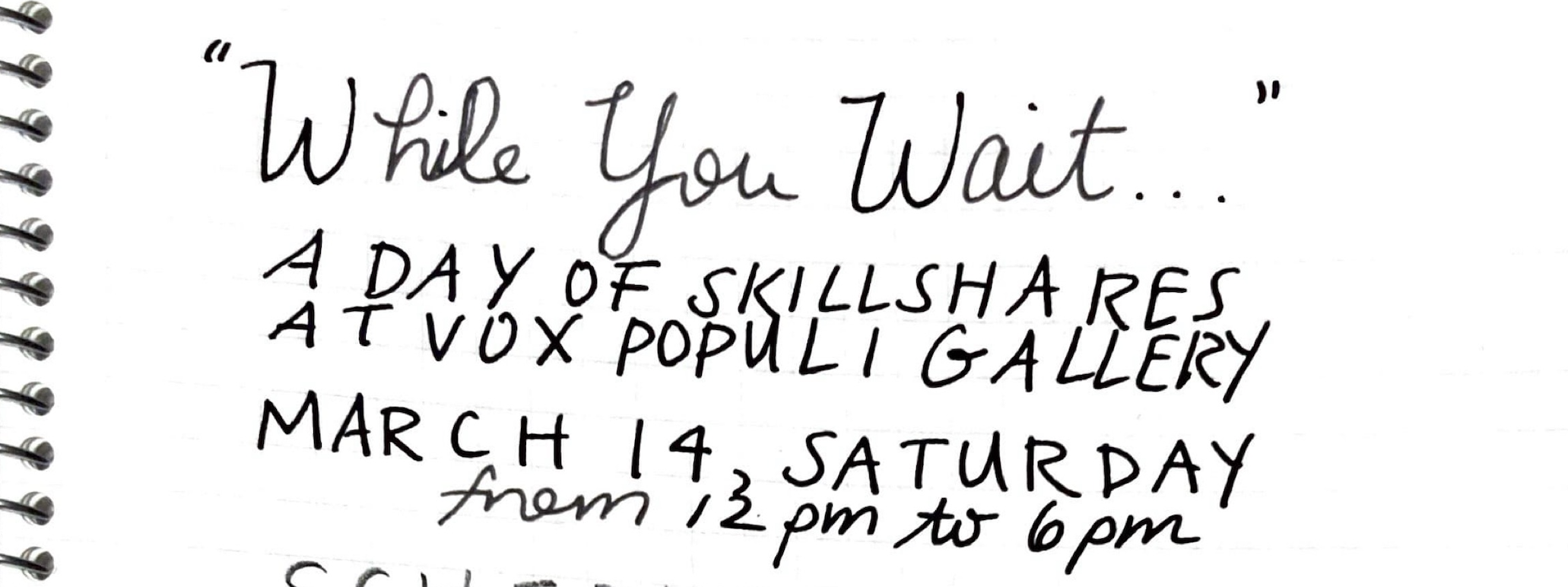 A day of skill shares taught by artists about what they like to do while they are waiting. All skillshares are free to attend, with a $5 suggested donation per skillshare. No one will be turned away for lack of funds. Light snacks will be provided.