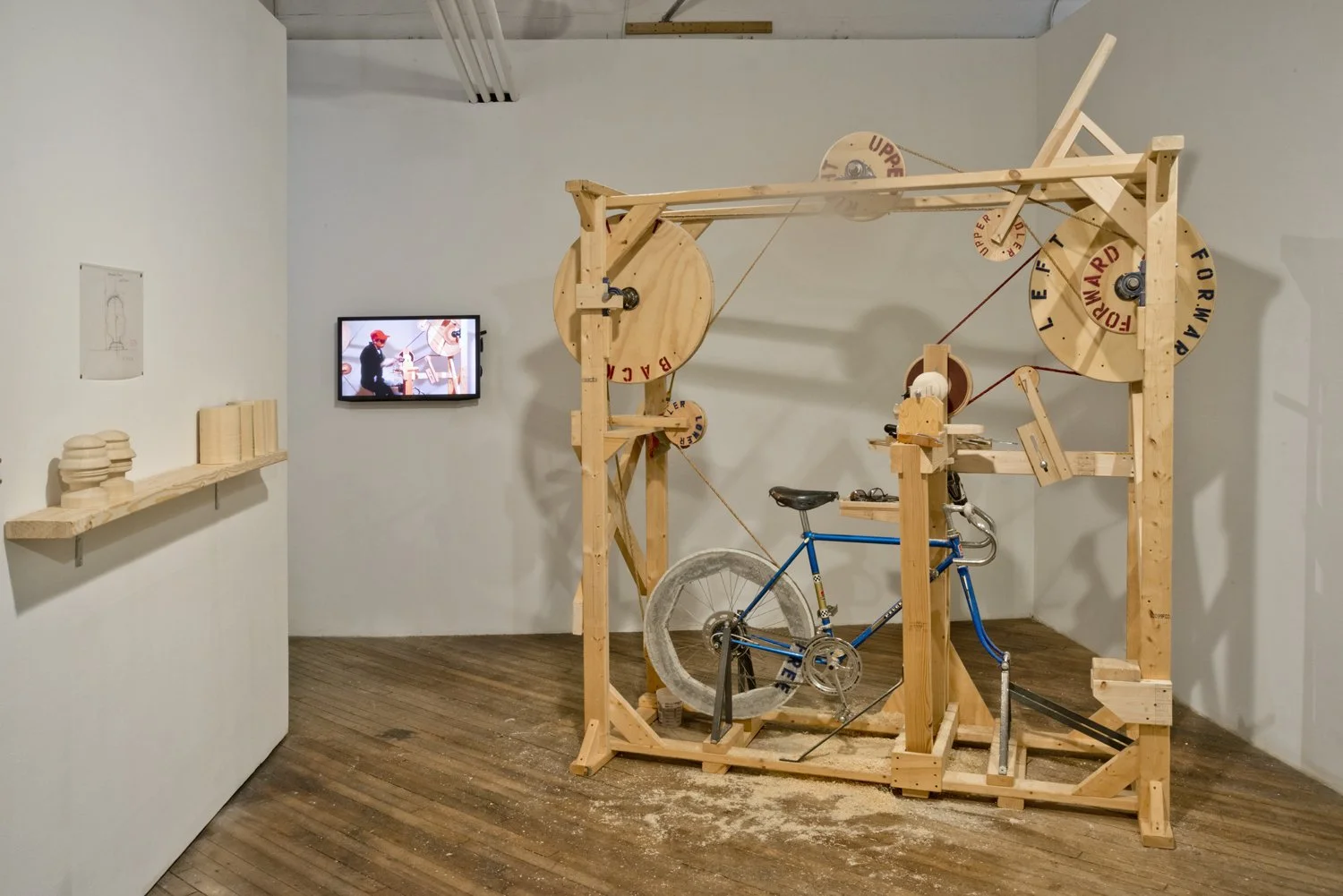 SELF-MADE proposes a personal, queer investigation into the ideals of American masculinity and self-reliance. Artist Gina Siepel creates multi-part sculptural objects using wood, steel, pedal-power, and other iconic 19th and 20th century materials to connect object making, self-making, and the mythic American “self-made man.” The work explores the potency and absurdity of an ideology that equates self-reliance and manual labor with nationalist glory, virility, and freedom. Siepel draws attention instead to the political possibilities of vulnerability, futility, and failure.