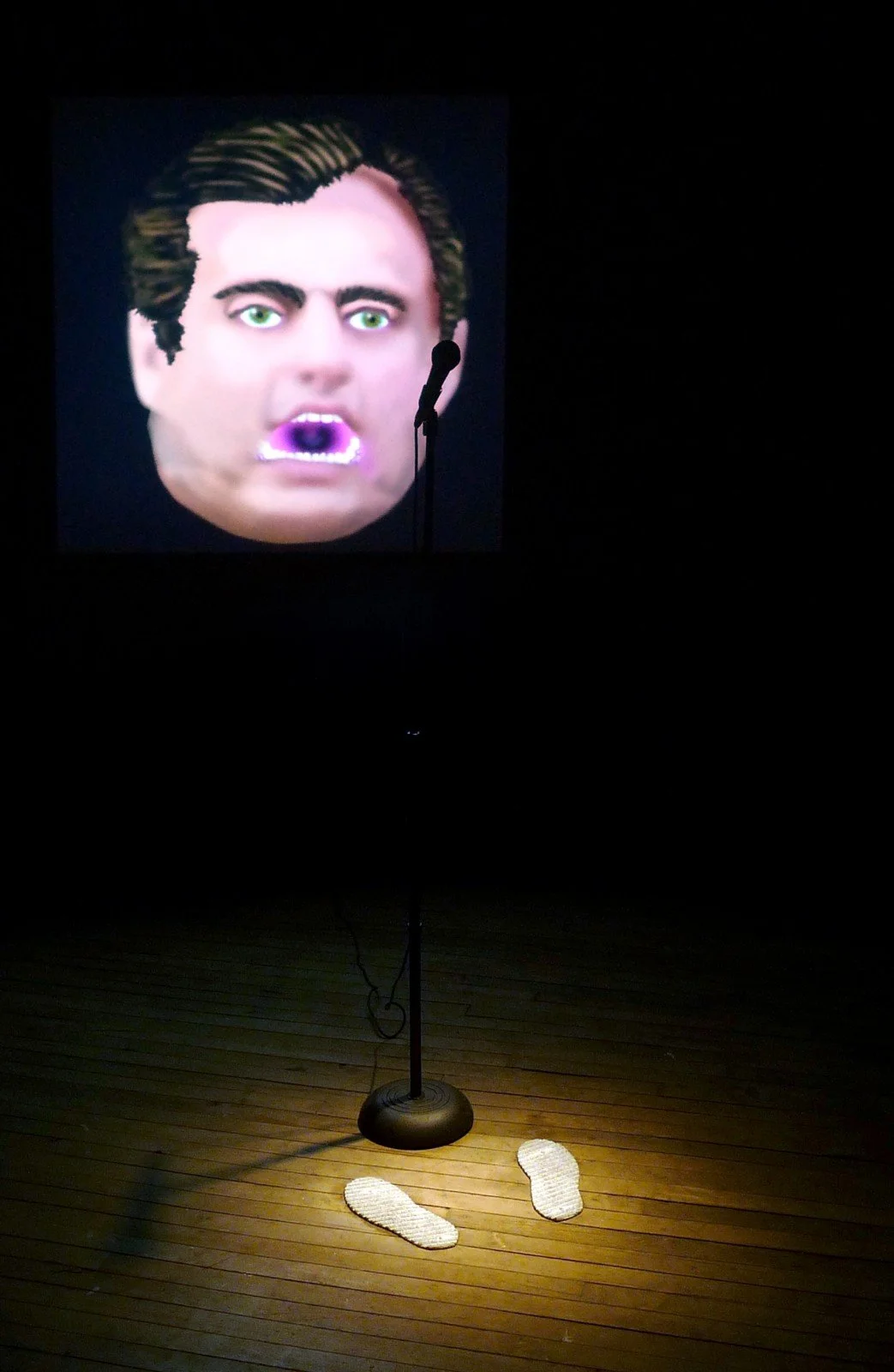 Christopher P. McManus presents Got It, an interactive video installation that explores a common speech habit and how it acts as a catalyst for non-communication. Contemporary power brokers, both established and aspiring, use the "Got It strategy" to speed through conversations and extract information relevant to their own interests. Information flow in conversations is usually random-conversations can be far ranging and spontaneous. Got It limits the possibility of tangents and automates conversation to focus on the basic elements of identification (e.g., what do you do for a living?, who do you know?) and self-promotion (i.e., how can you help me?). The use of Got It in conversations may seem a neutral placeholder but its ubiquity promotes the ways of the taskmaster, the bad listener, and the jerk. In this piece, viewers are encouraged to experience a conversation with a Got It man. This character is a projected head made from the composite characteristics of hedge fund managers, contest reality show judges, and stock photographs of multitaskers. The installation consists of a projected looping video, constructed screen, microphone, mixed and amplified audio, and reflective floor decals.