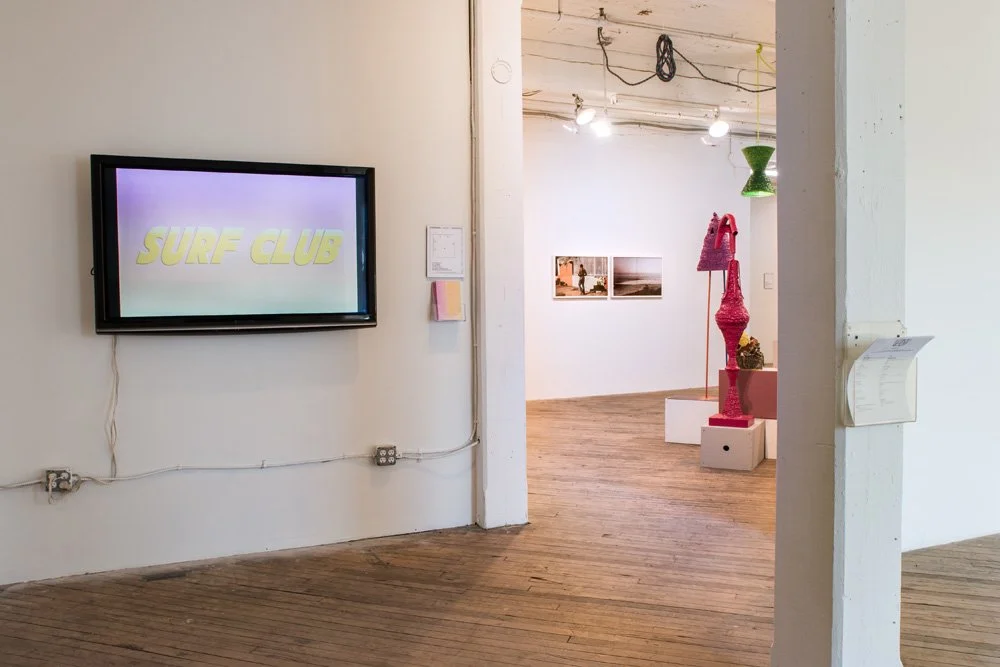 The results of this sharing model had unique effects on how each exhibition was shaped. With its loose and open framework, members could choose to respond to the previous works through a variety of approaches: its media, aesthetic composition, conceptual content, or a more personal response it evoked. With four distinct sub-exhibitions, Surf Club presents each room in a clockwise chronological order of the shared conversation accompanied by a unique gallery guide that will shed light on each of the works and the selection process. One group loosely examined self portraiture which evolved into a play with media, another explored social/biographical/cultural explorations by the artists, the third selected works that explored perception from the performative to the scientific, and the final began in abstraction and obstructed images. Yet the freedom of association inherent in this process allowed each gallery to present its own exceptions to the rule and non sequiturs representative of the open field of content the members could draw from. Surf Club toys with post-internet practice, and how the networks of digital sharing we rely on influence our real-life references, networks, and associations within the physical gallery space.