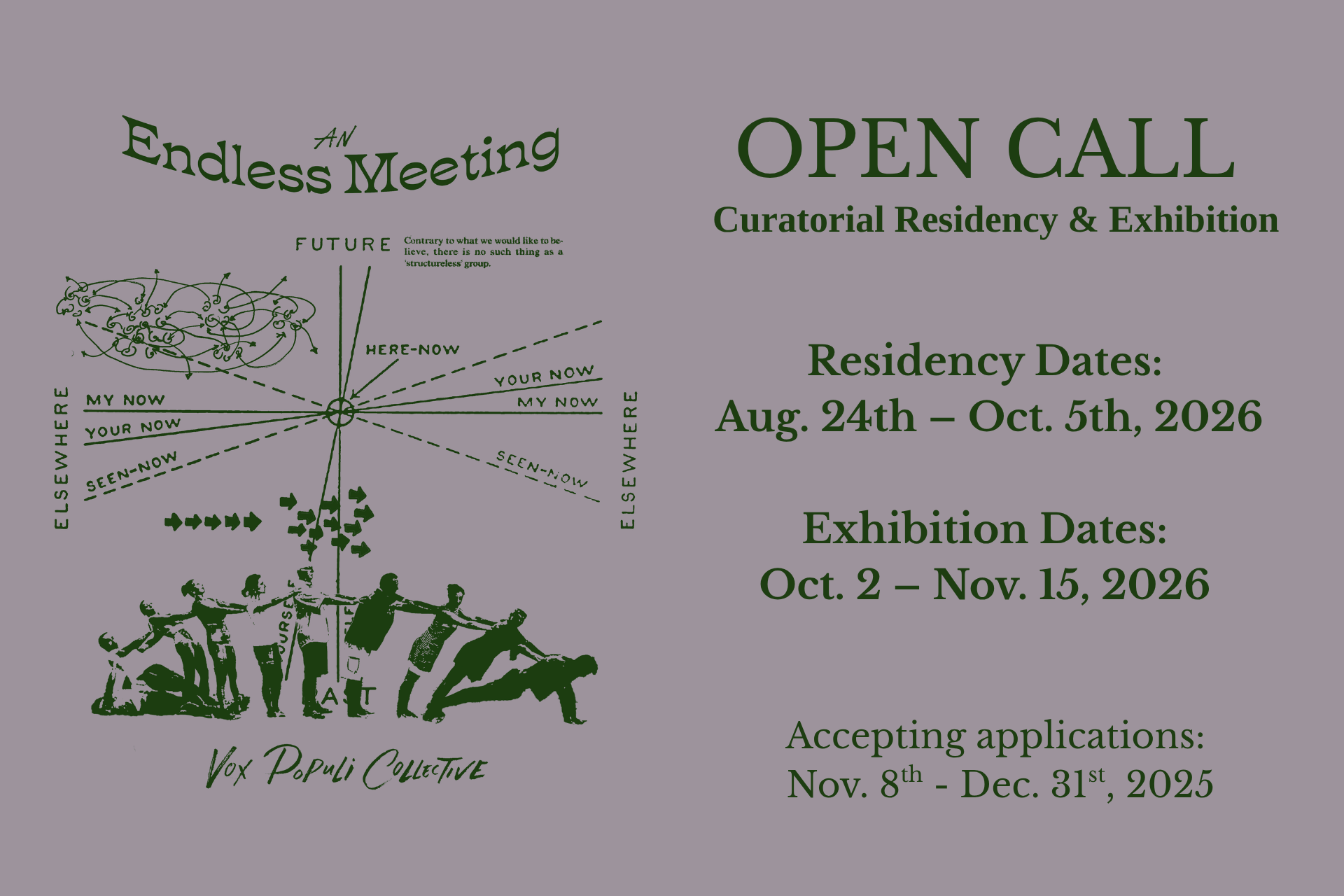 Vox Populi is accepting applications for our Curatorial Residency, part of the citywide Collective Futures festival and Vox’s project An Endless Meeting: Collective Process, Artistic Labor, and the Politics of Working Together. We invite a curatorial pair, two artists/curators from a DIY space, artist-run initiative, or collective located at least 50 miles outside of Philadelphia to participate in a one-month residency in August–September 2026.